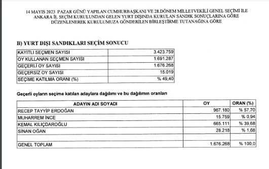 Kararda, yurt içi, yurt dışı ve gümrük kapıları dahil Cumhurbaşkanı Recep Tayyip Erdoğan’a 27 milyon 133 bin 849 kişinin (%49,52), Muharrem İnce’ye 235 bin 783 bin kişinin (%0,43), Kemal Kılıçdaroğlu’na 24 milyon 595 bin 178 kişinin (%44,88), Sinan Oğan’a 2 milyon 831 bin 239 kişinin (%5.17) oy kullandığı tespit edildi.